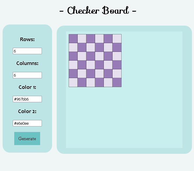 Checker Board: 2/20/26In this project, the user can generate checkerboards with custom colors and sizes. It is automatically black and white.