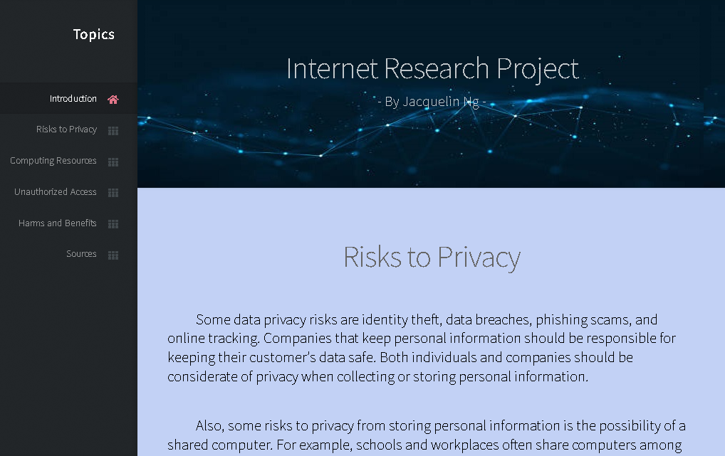 Research Project: 8/25/25I used the basics of HTML and CSS to design a simple website that shares information about computer safety.