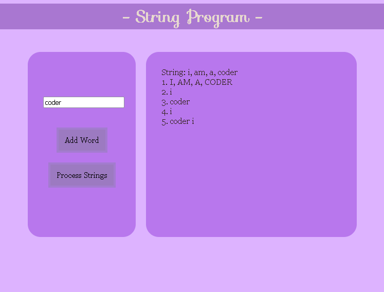 String Program: 2/4/26In this project, the user can enter strings and process them to create 5 different ways to categorize them.